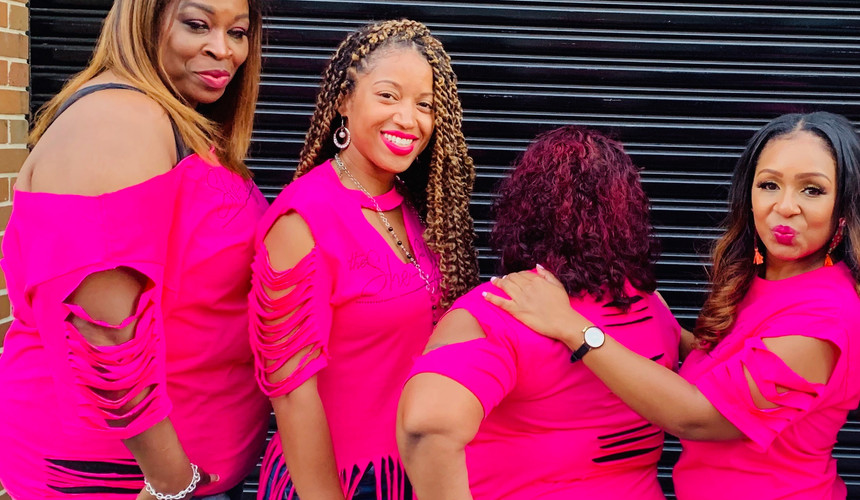 Last week my mom hosted a women's conference in Brooklyn, NY called "The She Effect Conference". It was such a powerful time with all my sisters. For the second day, we were given pink t-shirts labeled "She Effect" to wear for the concert portion,"Holy Girls Rock". Having an experience and a reputation for cutting up shirts and making it my own, I had gotten- what started out to be a few- requests to cut up shirts for the event. Before I knew it, word got around that I was cutting shirts and pretty soon everyone was asking me to do it for them.
